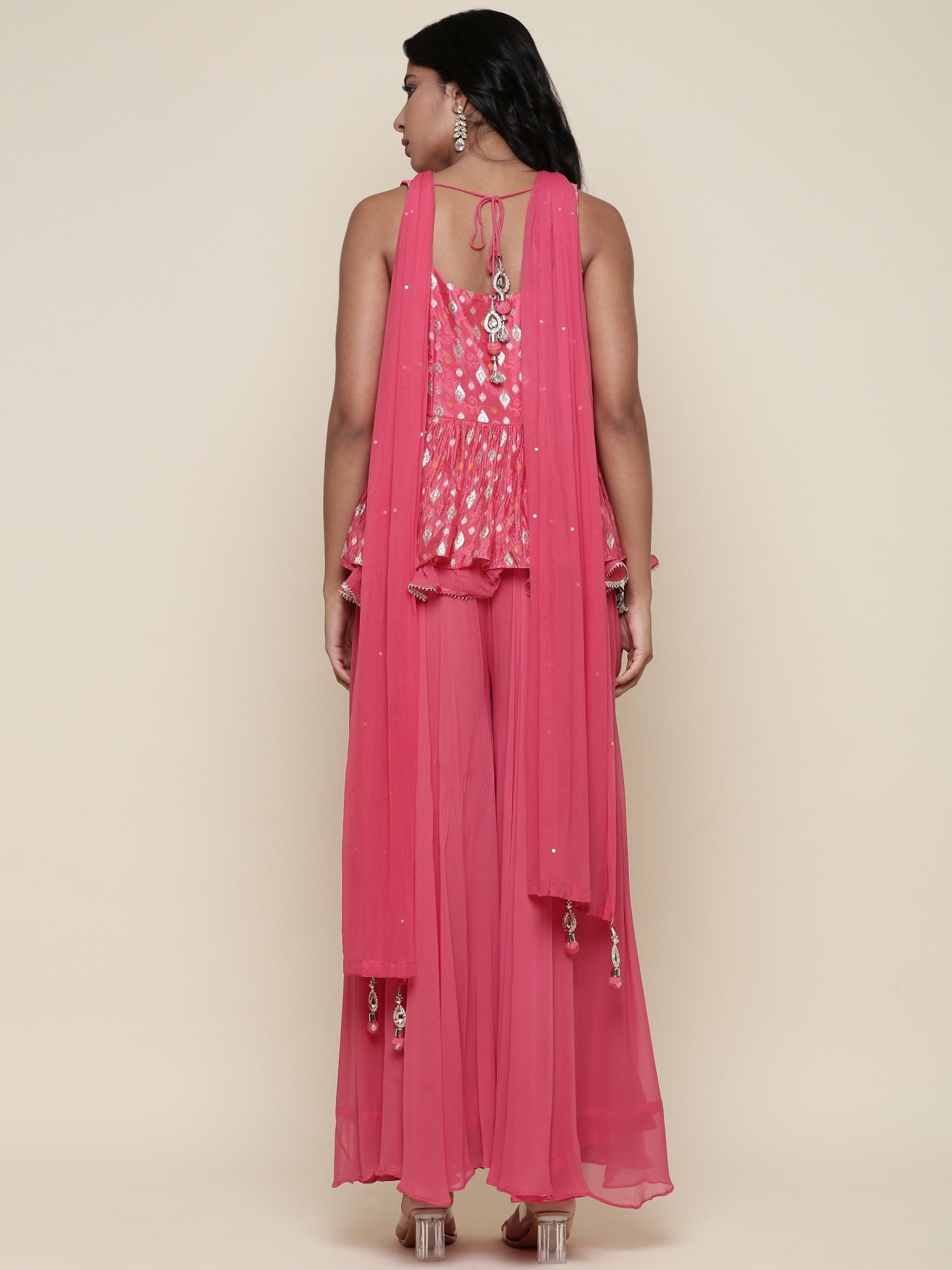 Elevate your wardrobe with the Ghajari georgette peplum and palazzo three-piece set. Crafted from lightweight georgette fabric, this ensemble combines comfort with elegance, featuring a flattering peplum top paired with stylish palazzo pants and a matching dupatta. Perfect for festive occasions or casual gatherings, it offers a graceful silhouette that ensures you stand out effortlessly. Embrace sophistication and ease in one stunning set.