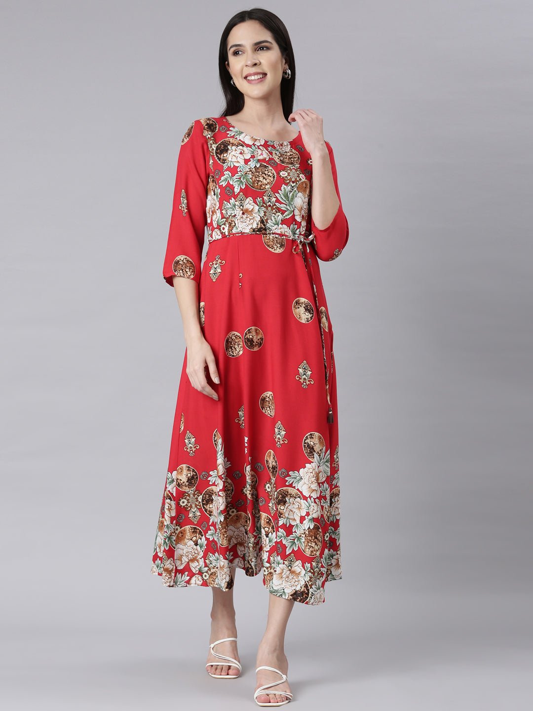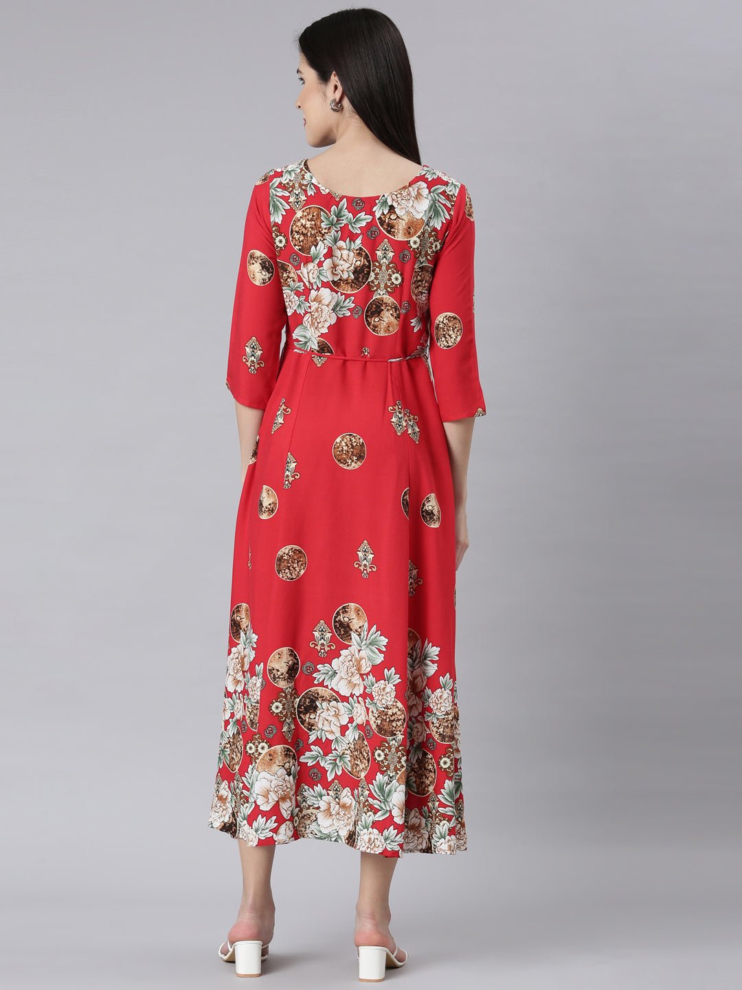 Be the first to review “Sadguru Red Curved-Cut Casual Floral Maxi Dresses”